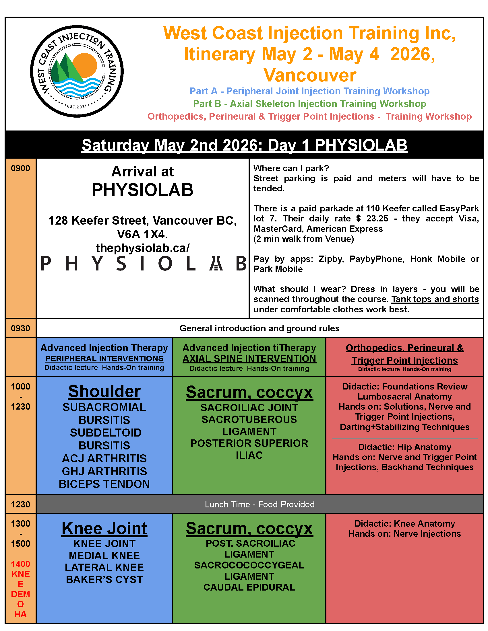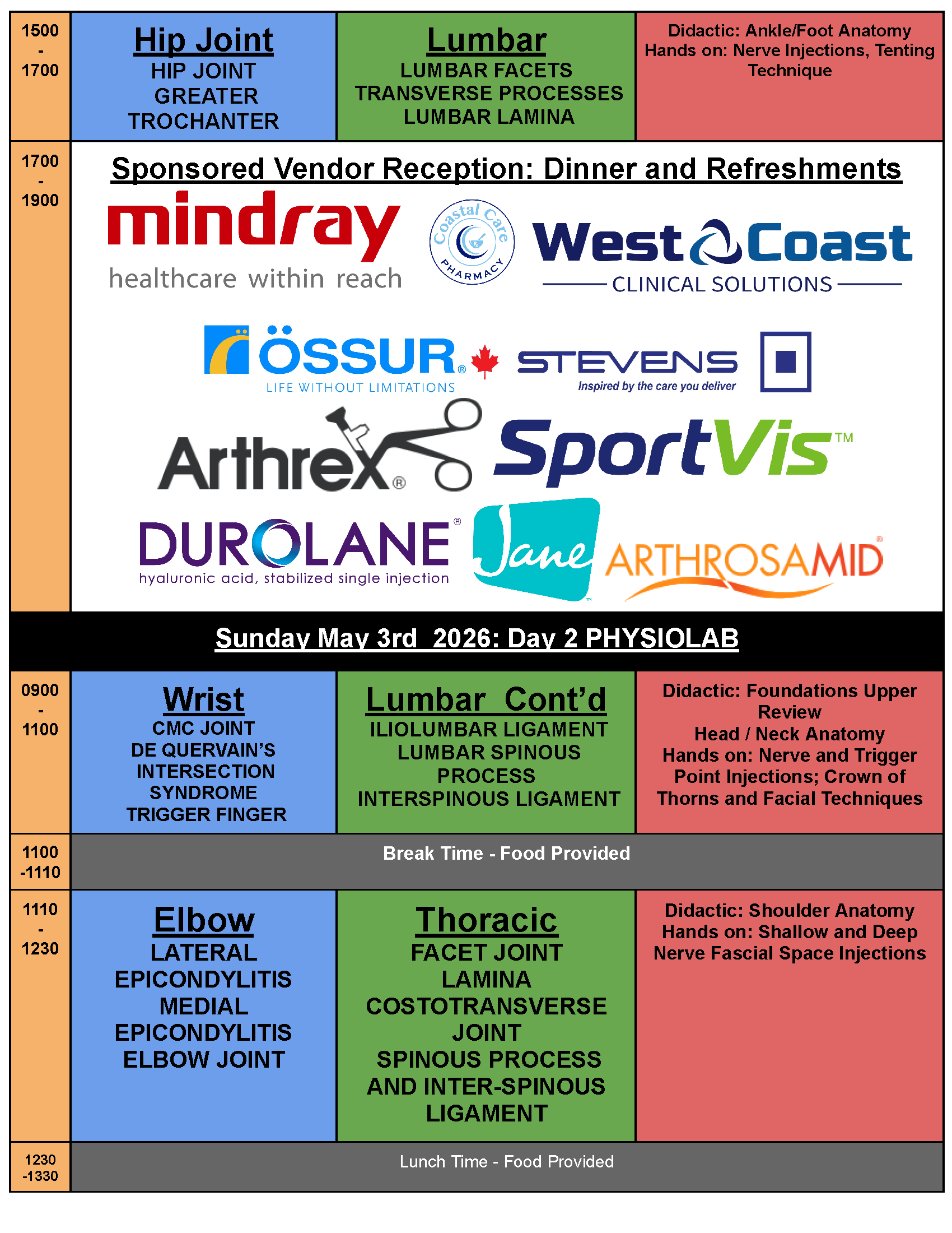 Our courses start at 9 am on Saturday in Vancouver and finish on Monday at 1 pm in Coquitlam. Saturday evening from 5-7pm we host a vendor reception with food and drink where you can meet and mingle with industry leading suppliers in the MSK interventional field.